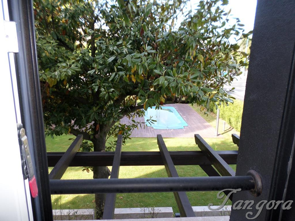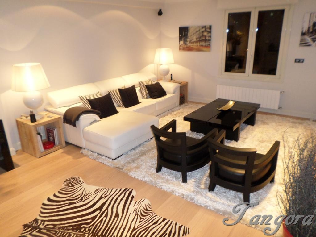 La parte izquierda del hall nos lleva al fantástico y luminoso salón, potenciado por la clara y bonita tarima de madera del suelo y de la abundancia de tonos blancos que predomina en la decoración del mismo, rota por alguna pincelada de negro. Desde el salón tenemos unas fantásticas vistas de la piscina y del bonito jardín de la finca.