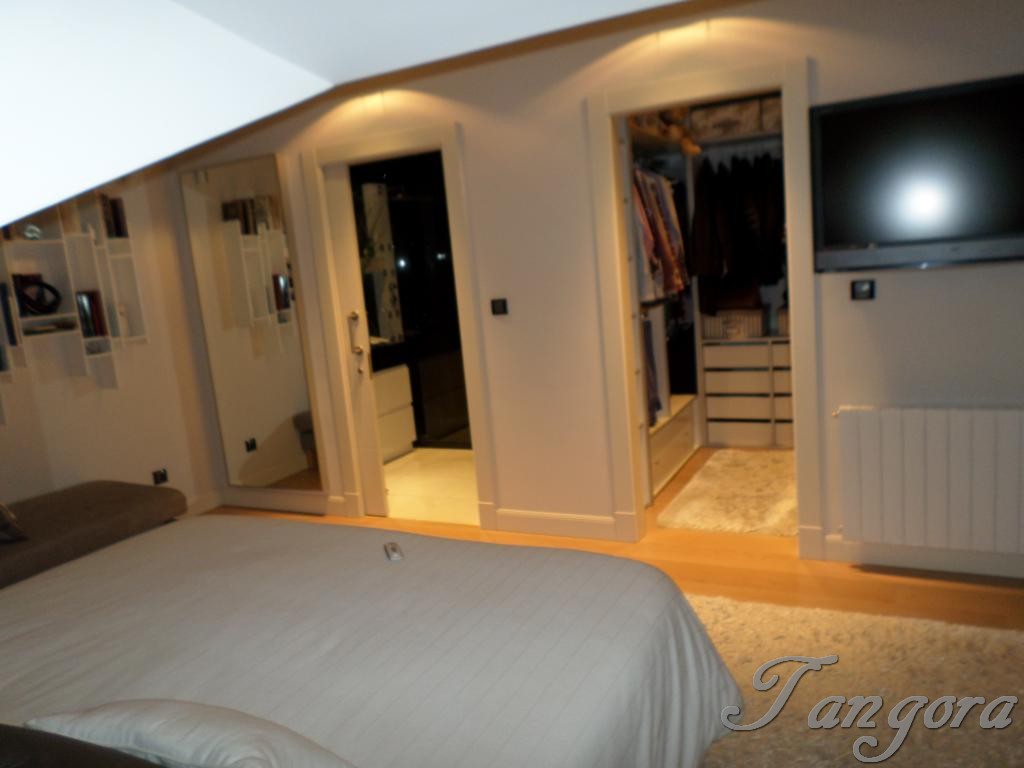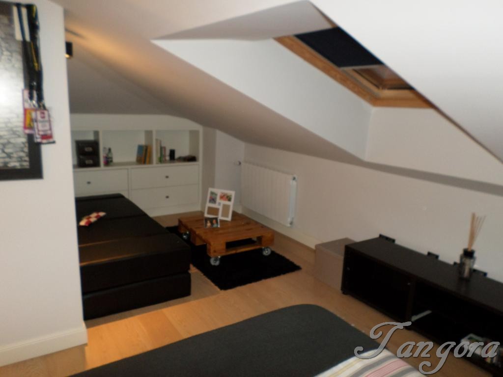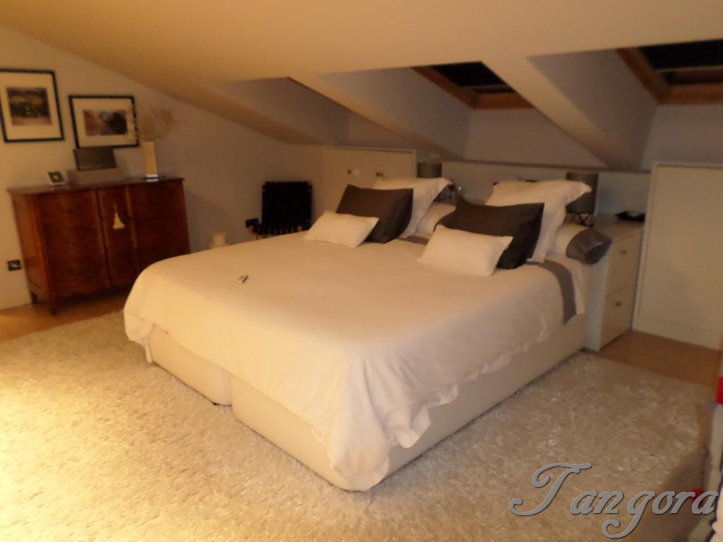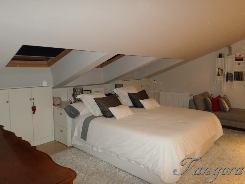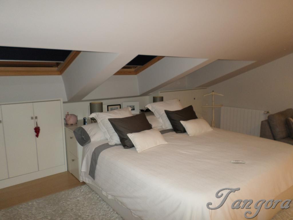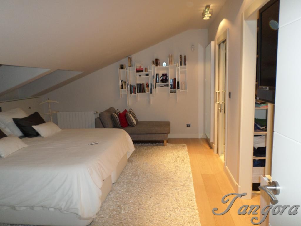Subiendo una preciosa escalera llegamos al piso superior en el que nos encontramos dos magníficas suites; la habitación principal es un espaciosísimo cuarto abuhardillado que cuenta con un gran vestidor y un fabuloso cuarto de baño, en blanco y negro, amplio, elegante y en que se ha instalado una magnífica ducha de hidromasaje. La otra habitación, también abuhardillada, tiene una acogedora zona de estar, y su propio cuarto de baño, éste en mármol beige y con una luz espectacular gracias a un bonito tragaluz.