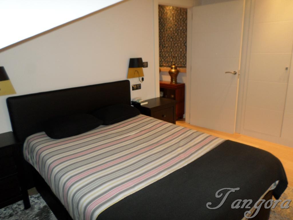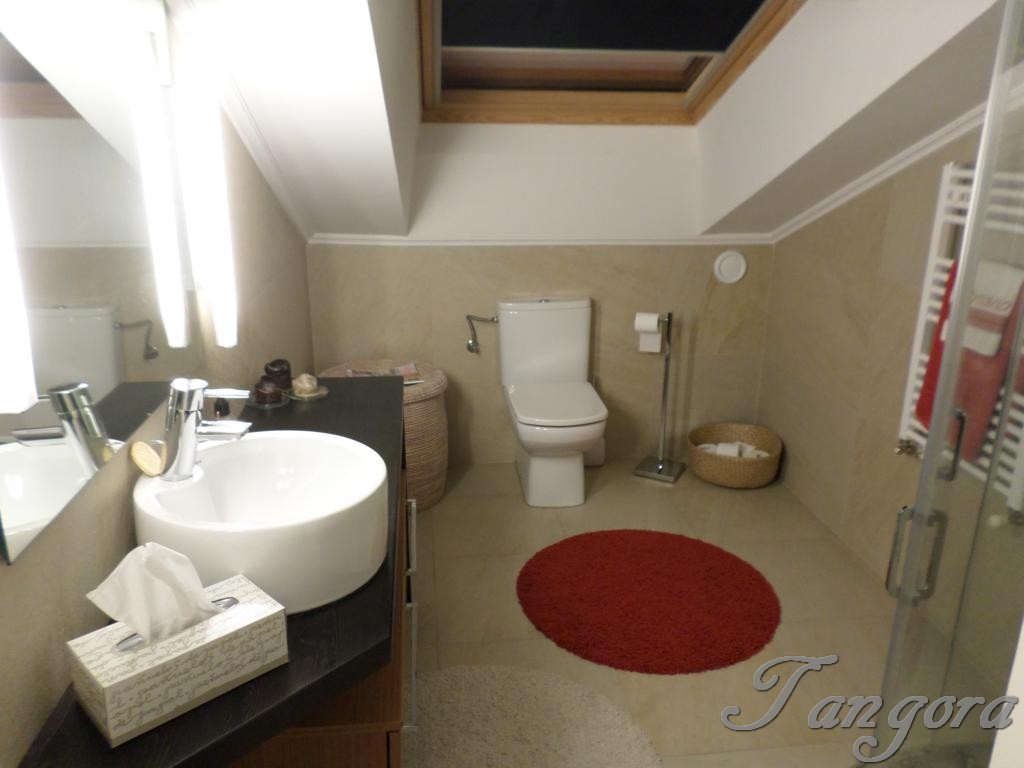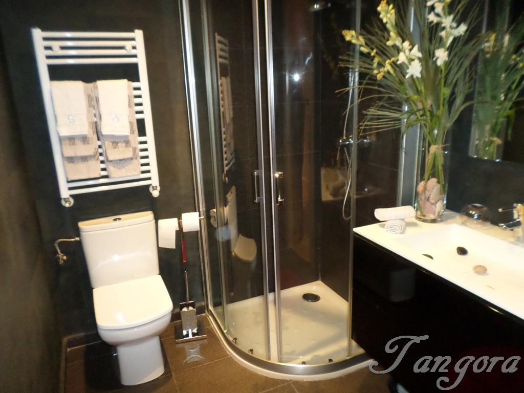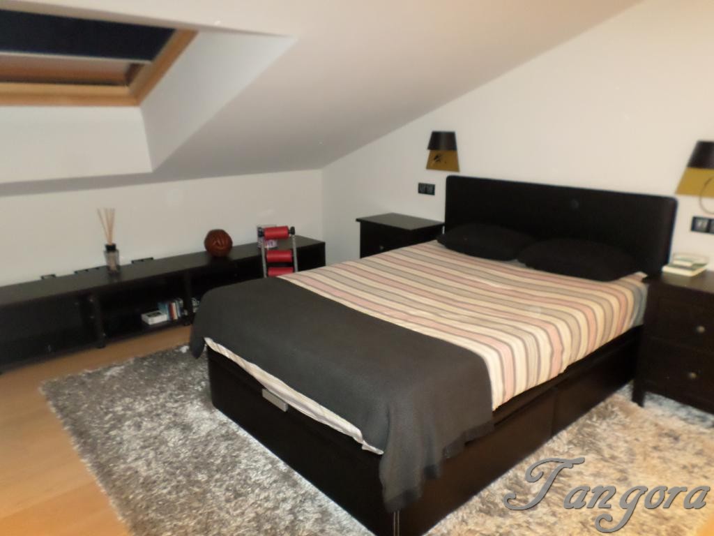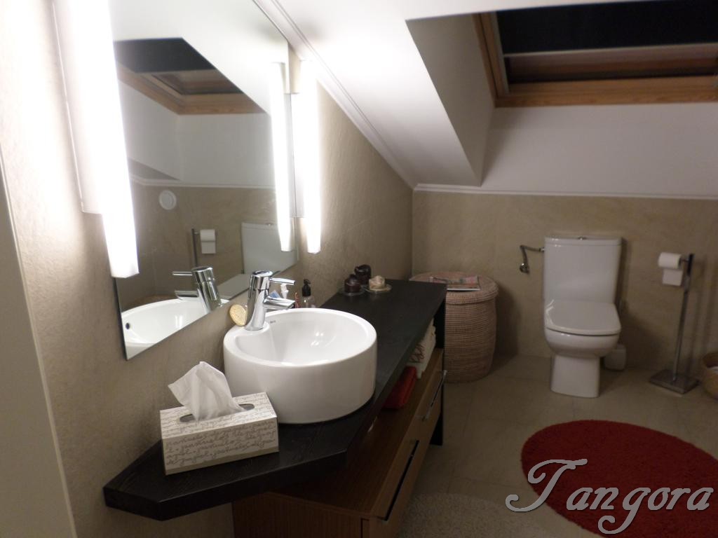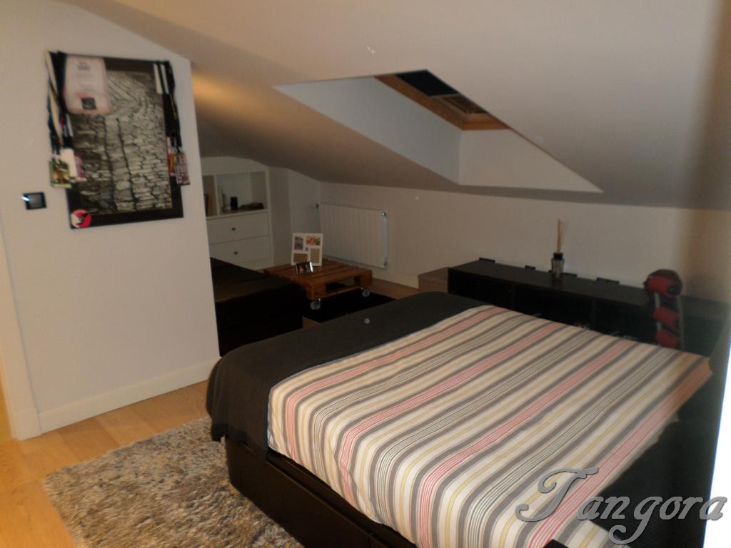 Subiendo una preciosa escalera llegamos al piso superior en el que nos encontramos dos magníficas suites; la habitación principal es un espaciosísimo cuarto abuhardillado que cuenta con un gran vestidor y un fabuloso cuarto de baño, en blanco y negro, amplio, elegante y en que se ha instalado una magnífica ducha de hidromasaje. La otra habitación, también abuhardillada, tiene una acogedora zona de estar, y su propio cuarto de baño, éste en mármol beige y con una luz espectacular gracias a un bonito tragaluz.