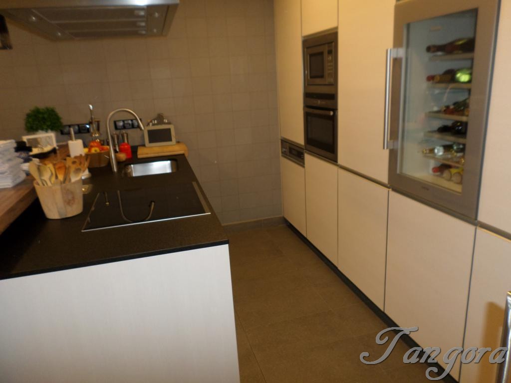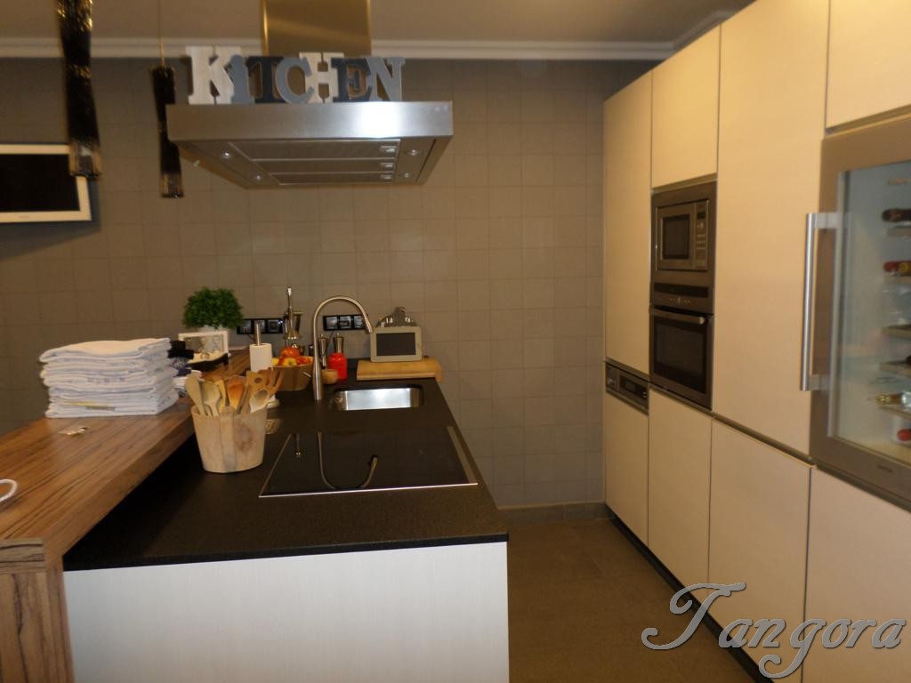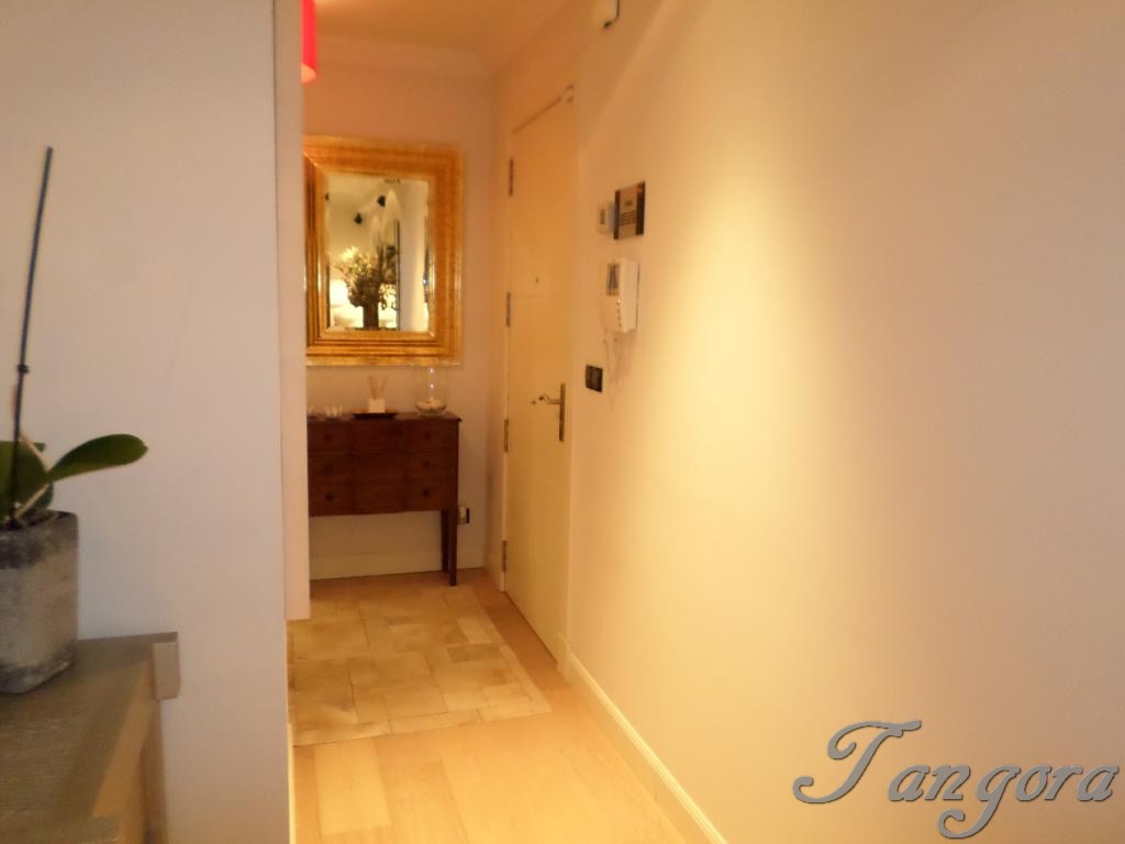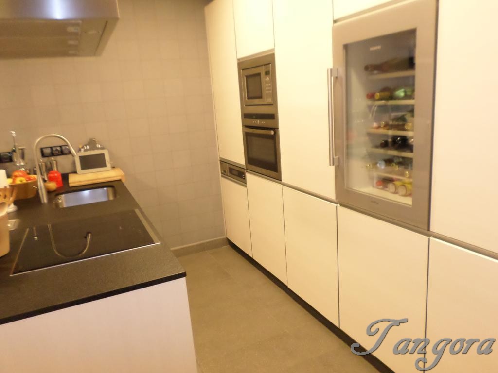 Accedemos al piso y el hall nos lleva a la derecha a la modernísima y fantástica cocina, equipada con todo detalle y de última generación, cuenta con una estupenda zona de office, además de una bonita barra de desayunos en cálida madera. Frente a la cocina tenemos un práctico y amplio armario gabanero-despensa, y entre ambos un precioso cuarto de baño en elegante y rotundo negro, exquisito y moderno, como todo en ésta casa..
