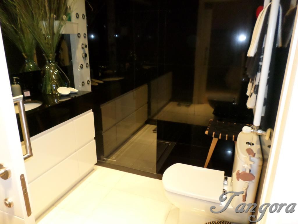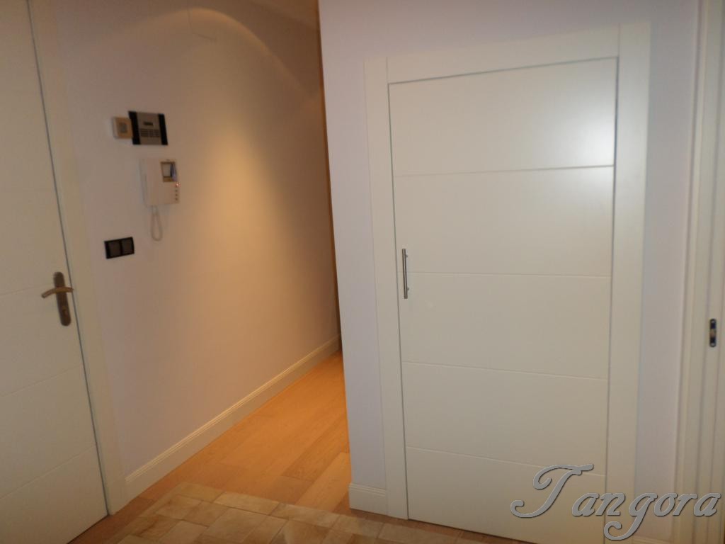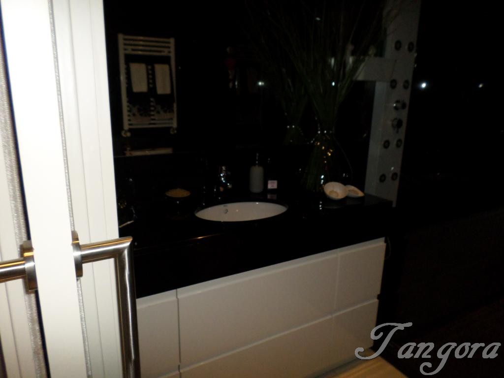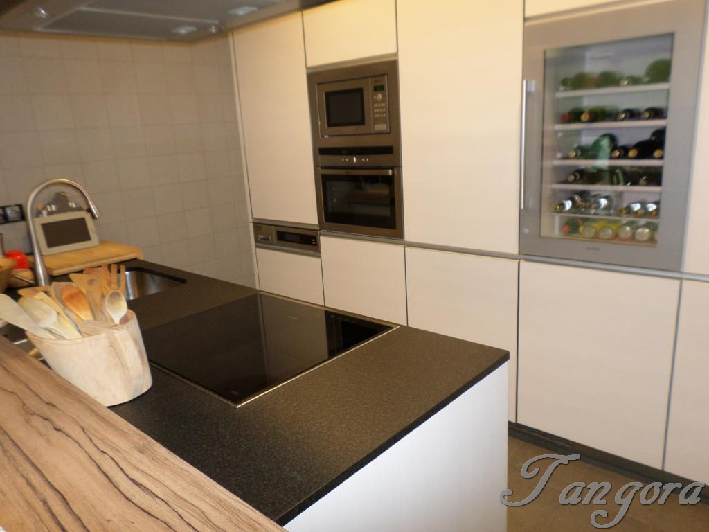 Accedemos al piso y el hall nos lleva a la derecha a la modernísima y fantástica cocina, equipada con todo detalle y de última generación, cuenta con una estupenda zona de office, además de una bonita barra de desayunos en cálida madera. Frente a la cocina tenemos un práctico y amplio armario gabanero-despensa, y entre ambos un precioso cuarto de baño en elegante y rotundo negro, exquisito y moderno, como todo en ésta casa..